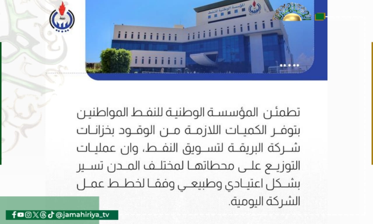 وأعلنت مؤسسة النفط في بيان اليوم، طمأنة المواطنين بتوفر الكميات اللازمة من الوقود بخزانات شركة البريقة لتسويق النفط.