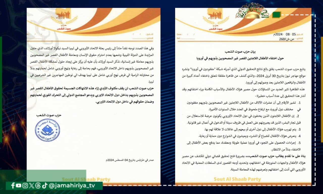 واختتم حزب صوت الشعب، إنه لن يقف مكتوف الأيدي إزاء هذه الانتهاكات الجسيمة لحقوق الأطفال القصر غير المصحوبين بذويهم بداخل دول الاتحاد الاوربي، داعيا المجتمع الدولي إلى التحرك الفوري لحمايتهم وضمان حقوقهم في داخل دول الاتحاد الاوربي.