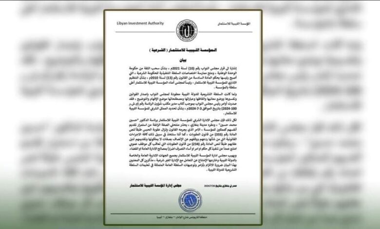 حذرت المؤسسة الليبية للاستثمار، التابعة للحكومة المختارة من البرلمان، من المحاولات التي وصفتها بـ”المشبوهة”، لفك الحظر المفروض على الأموال الليبية المجمدة.