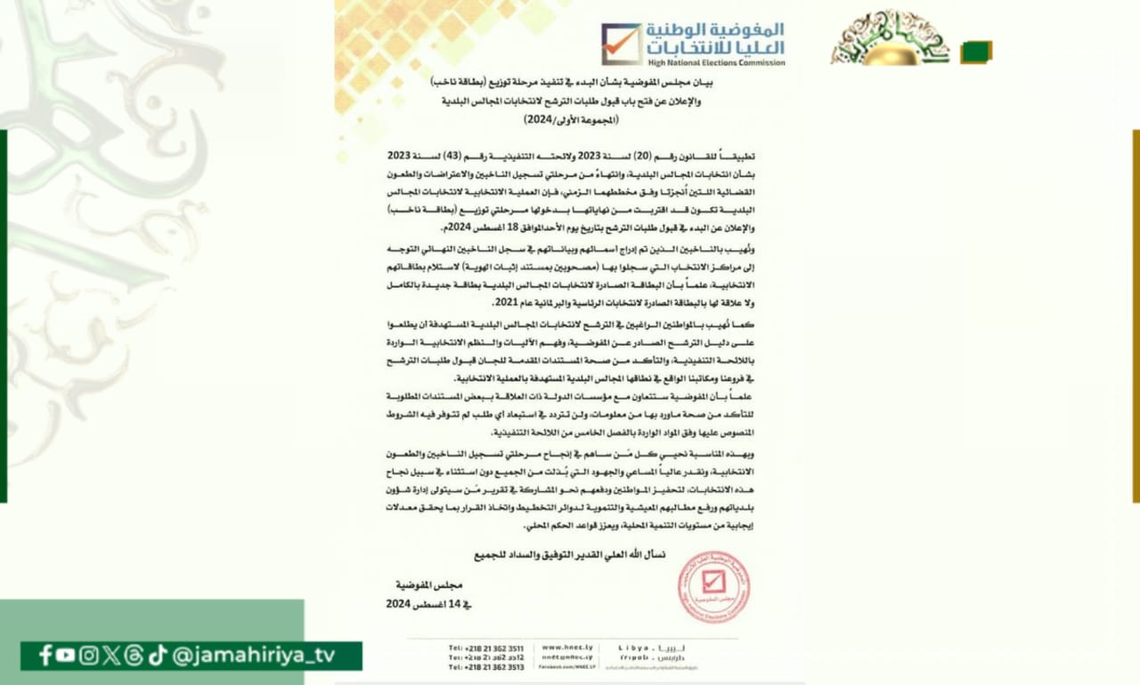 عاجل// المفوضية العليا للانتخابات تعلن فتح باب قبول طلبات الترشح لانتخابات المجالس البلدية المجموعة الأولى.