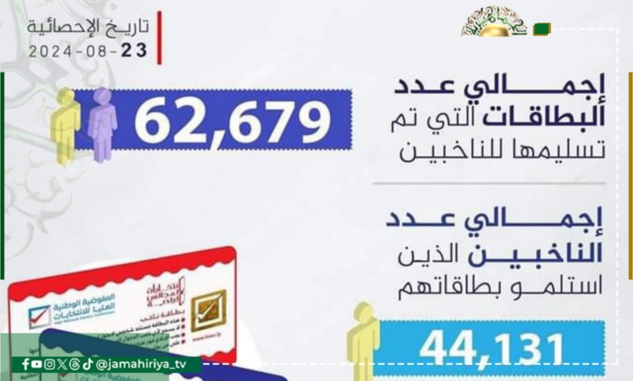 أعلنت المفوضية الوطنية العليا للانتخابات، تسليم 62 ألفا و679 بطاقة ناخب خاصة بالمرحلة الأولى من انتخابات المجالس البلدية.