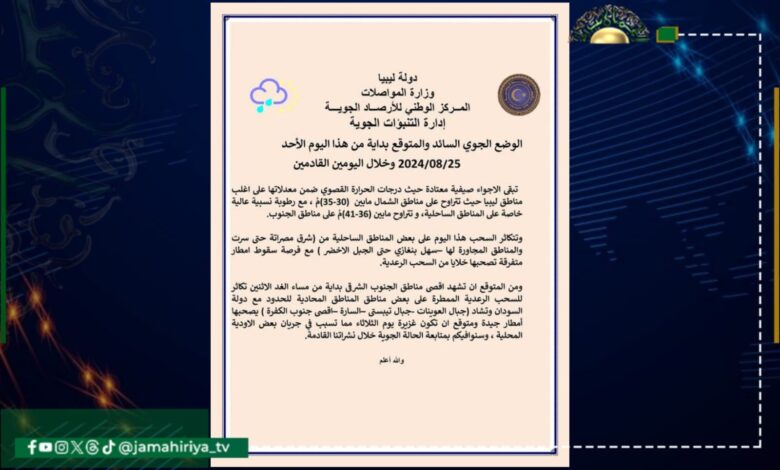 الأرصاد: وجود أجواء صيفية معتدلة على معظم مناطق ليبيا مع رطوبة عالية