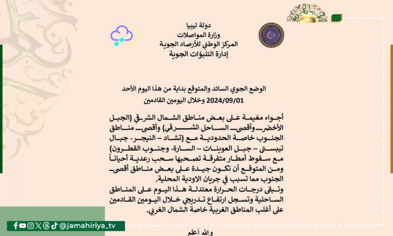 حالة السماء: تتكاثر السحب من حين لآخر مع احتمال سقوط أمطار خفيفة على الجفرة و الشويرف ومن المتوقع أن تكون جيدة تصحبها خلايا رعدية على المناطق الحدودية مع (تشاد والنيجر) وجنوب القطرون مما قد تسبب في جريان بعض الأودية.