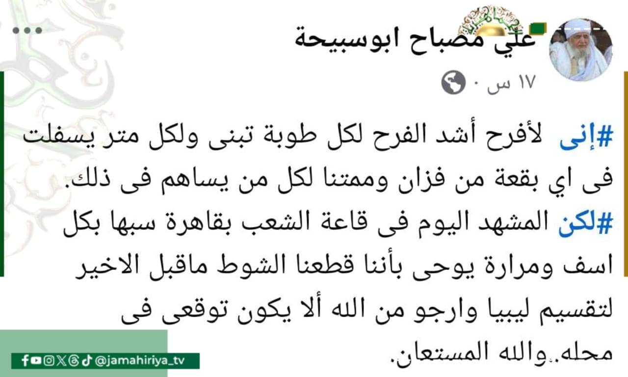اكد على مصباح أبوسبيحة رئيس المجلس الأعلى لقبائل ومدن فزان ورءيس فريق المصالحة الوطنية للدكتور سيف الإسلام القذافي، “المشهد اليوم فى قاعة الشعب بقاهرة سبها يوحى بأننا قطعنا الشوط ما قبل الأخير لتقسيم ليبيا”