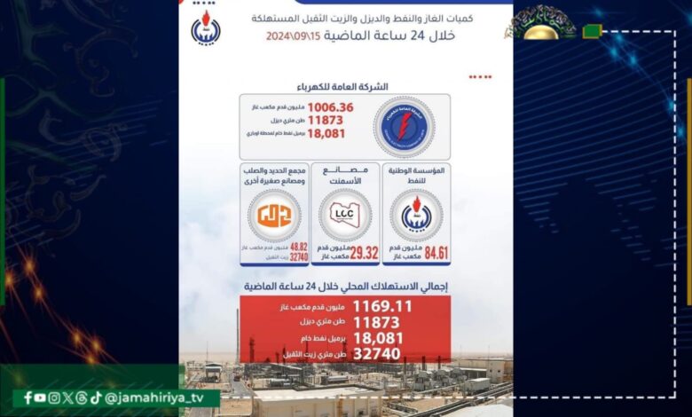 نشرت مؤسسة النفط كميات الغاز الطبيعي والنفط والديزل المحالة إلى جهات الاستهلاك خلال الـ 24 ساعة الماضية.