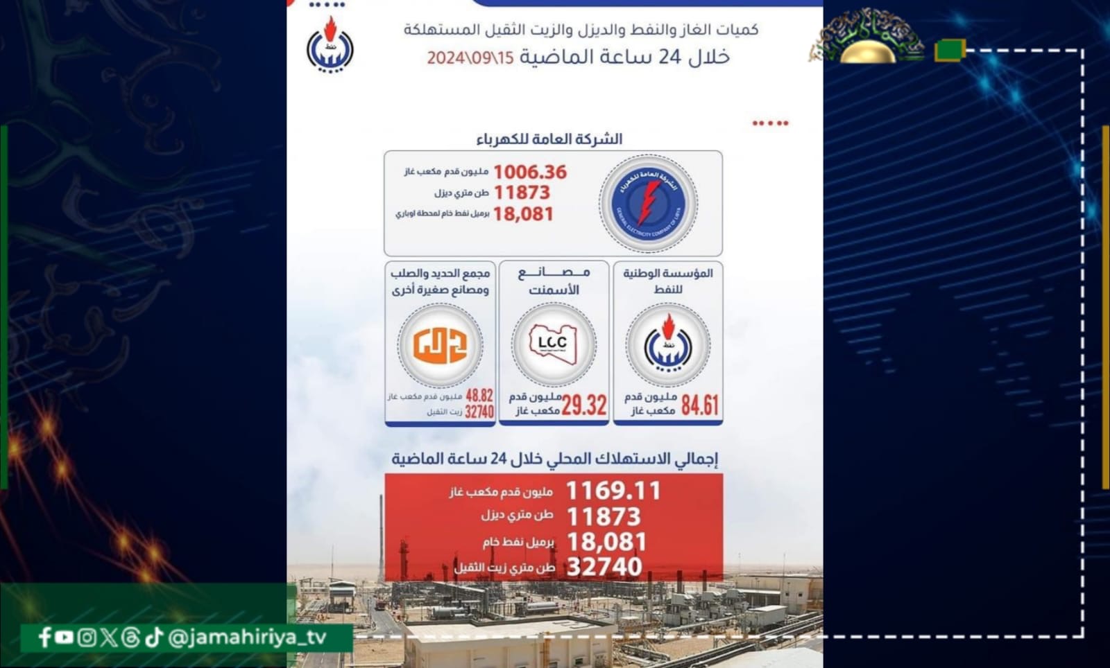• 11873 طن متري ديزل، خلال 24 ساعة الماضية للشركة العامة للكهرباء، و18,081 برميل نفط خام لمحطة أوباري.