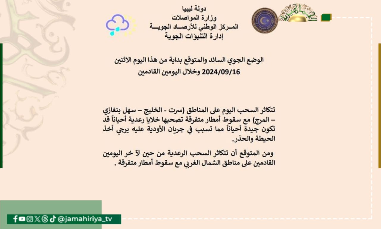 تتكاثر السحب اليوم على المناطق (سرت – الخليج – سهل بنغازي – المرج) مع سقوط أمطار متفرقة تصحبها خلايا رعدية أحياناً قد تكون جيدة أحياناً مما تسبب في جريان الأودية عليه يرجي أخذ الحيطة والحذر.