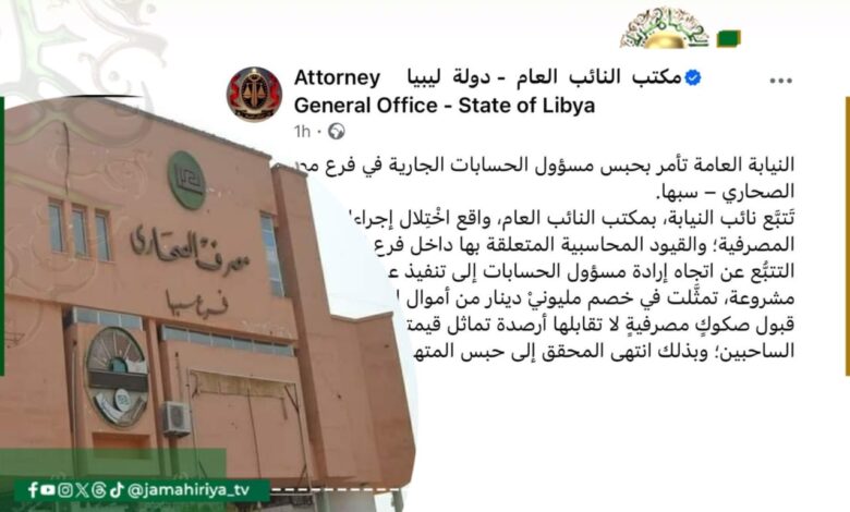 أمرت النيابة العامة بحبس مسؤول الحسابات الجارية في فرع مصرف الصحاري سبها
