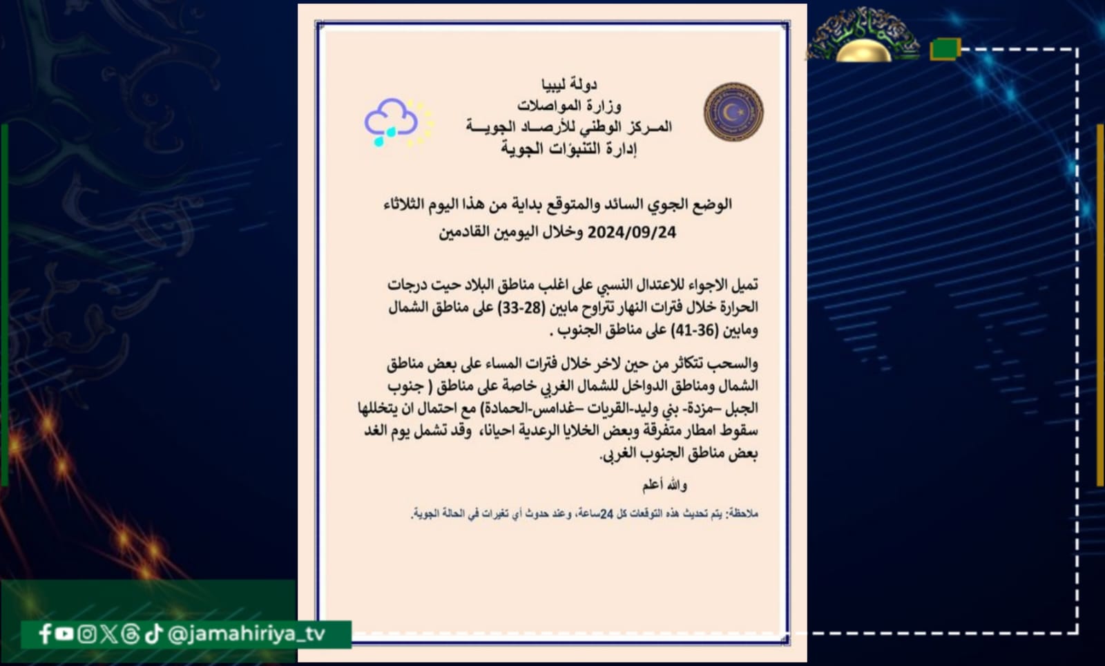 وجاء بيان الأحوال الجوية المتوقعة على ليبيا كالتالي:-