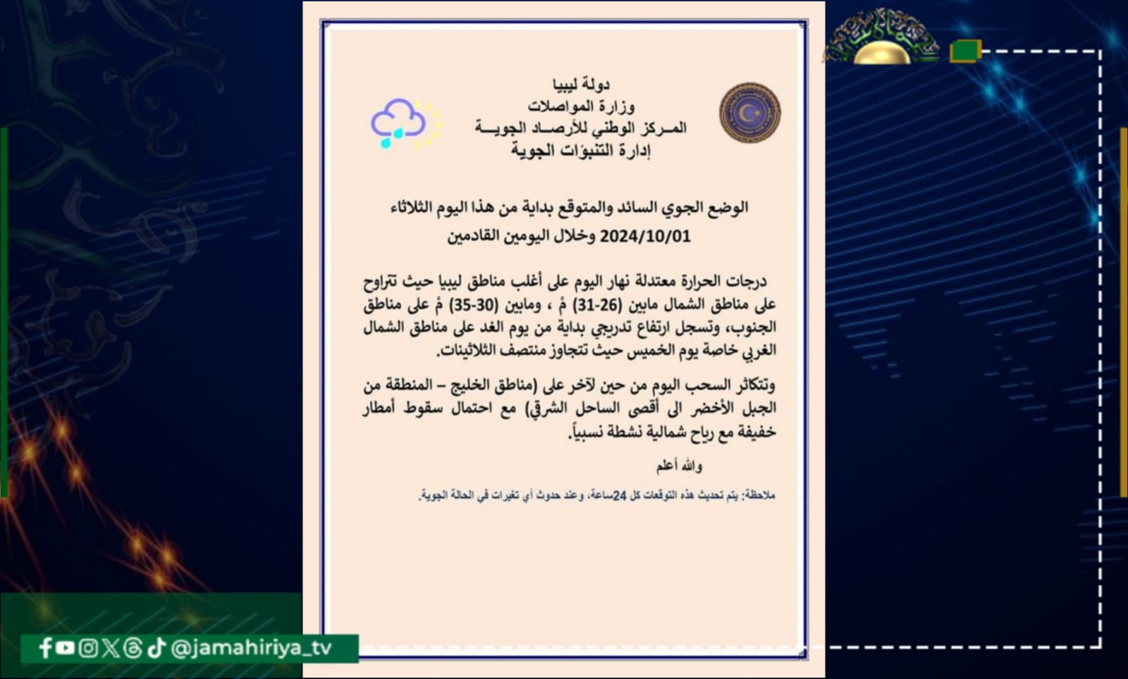 وجاء بيان الأحوال الجوية المتوقعة على ليبيا كالتالي:-