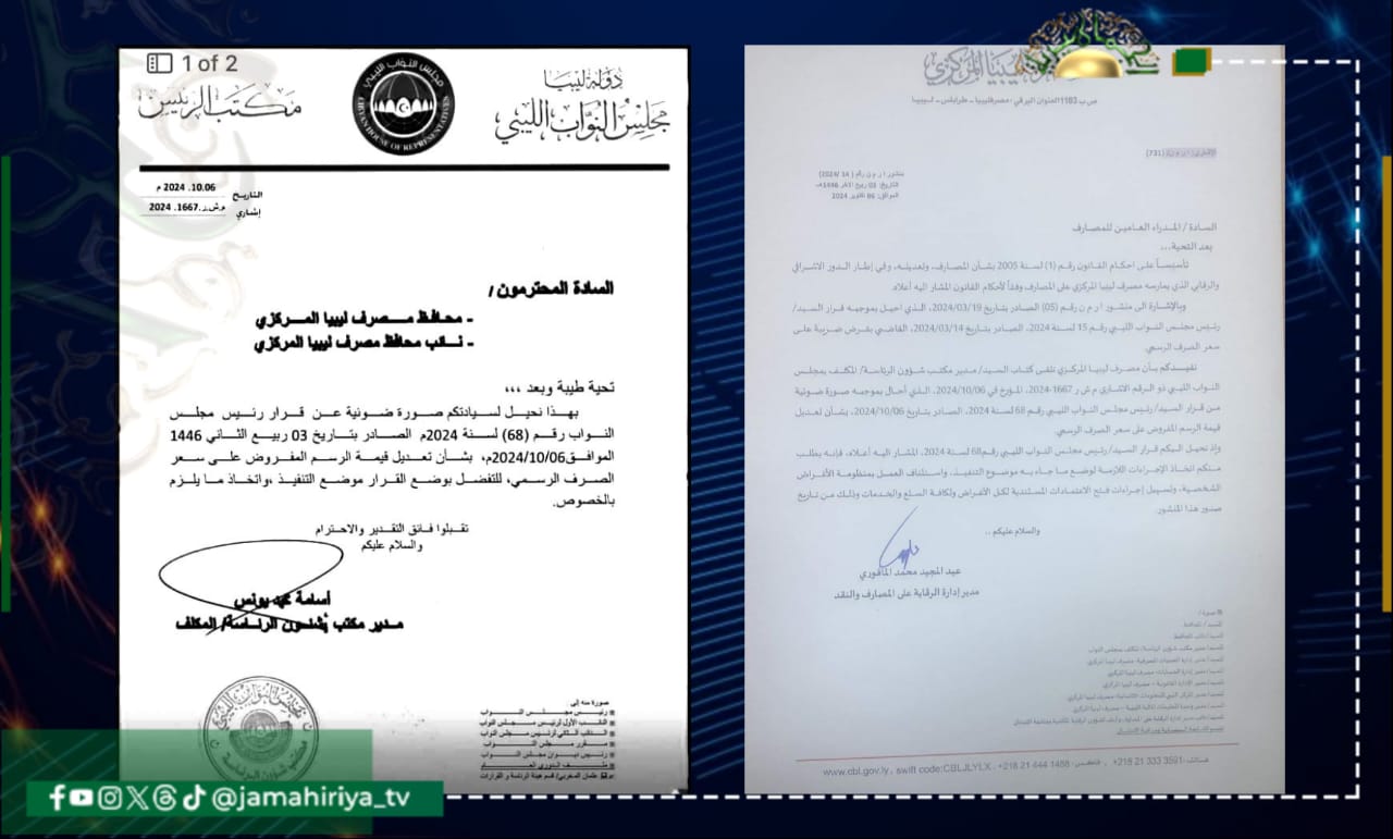 عممت إدارة الرقابة على المصارف والنقد، بمصرف ليبيا المركزي، قرار مجلس النواب بشأن تخفيض الرسم على النقد الأجنبي، واتخاذ الاجراءات اللازمة لوضعه موضع التنفيذ.