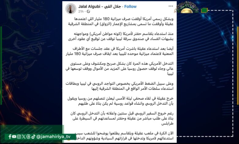 كشف عضو المكتب الإعلامي لعملية ما يسمى ببركان الغضب جلال القبي أن أمريكا أوقفت صرف ميزانية الـ180 مليار واستدعت بلقاسم حفتر كونه مواطن أمريكي وواجهته بشبهات الفساد ثم استدعت رئيس مجلس النواب عقيلة صالح لتباشر اعتماد ميزانية موحدة لليبيا لوقف حصول روسيا على المزيد من الأموال.