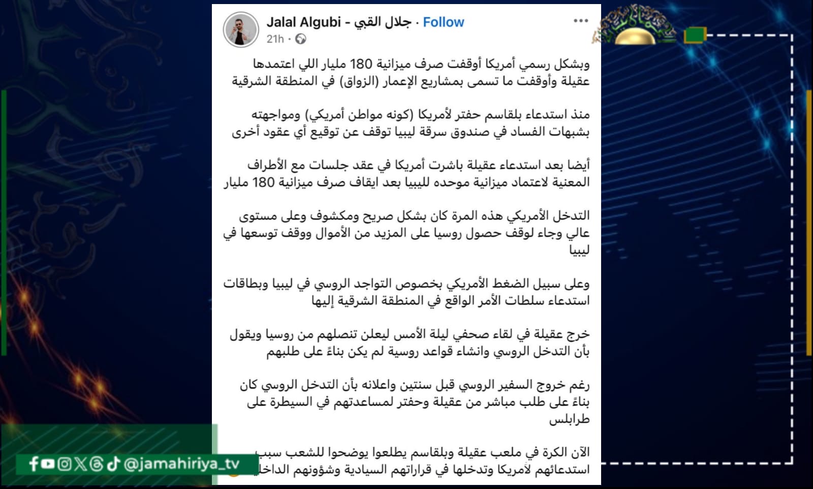 وأختتم منشوره قائلا ” الآن الكرة في ملعب عقيلة وبلقاسم يطلعوا يوضحوا للشعب سبب استدعائهم لأمريكا وتدخلها في قراراتهم السيادية وشؤونهم الداخلية”.