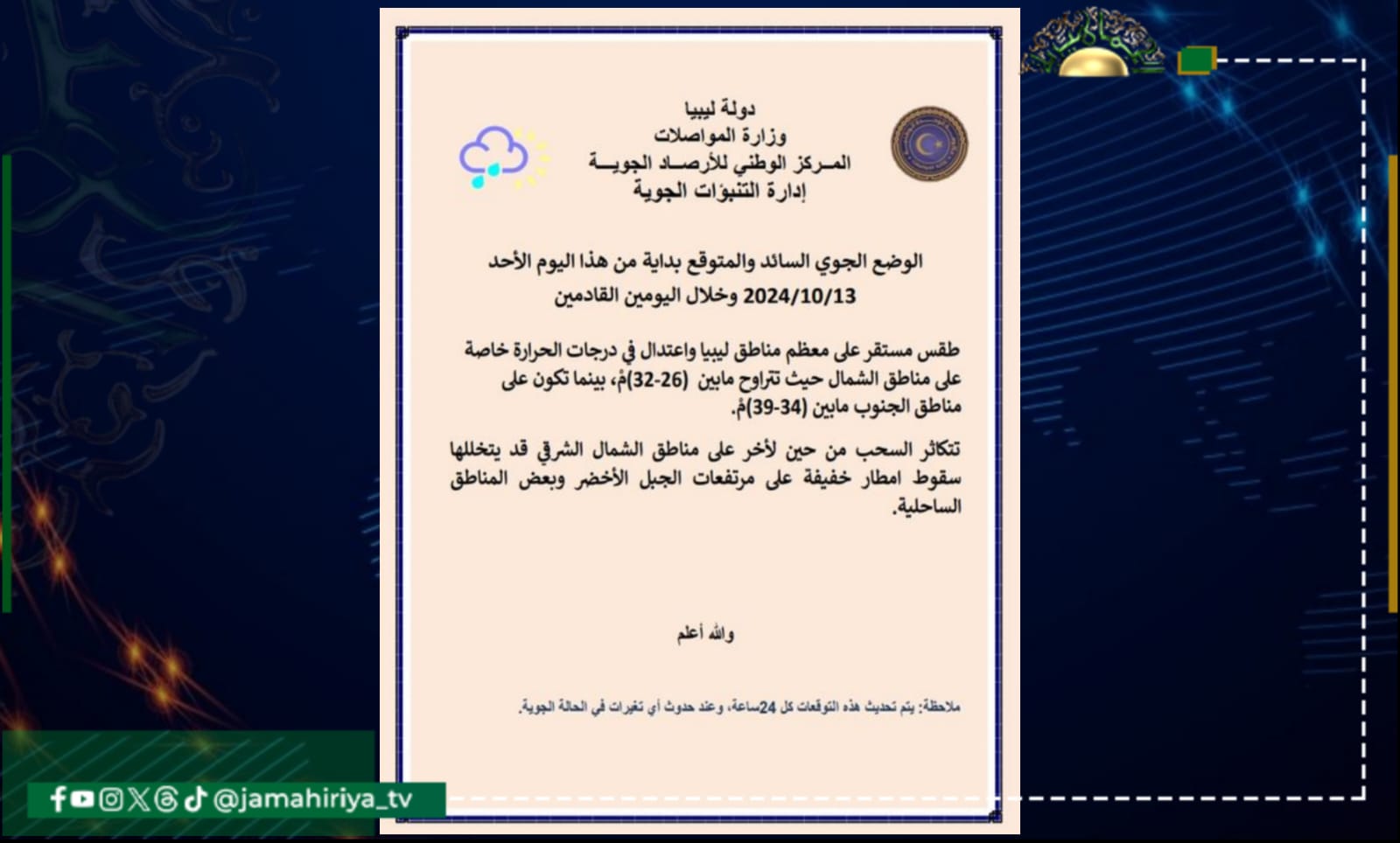 وجاء بيان الأحوال الجوية المتوقعة على ليبيا اليوم كالتالي:-
