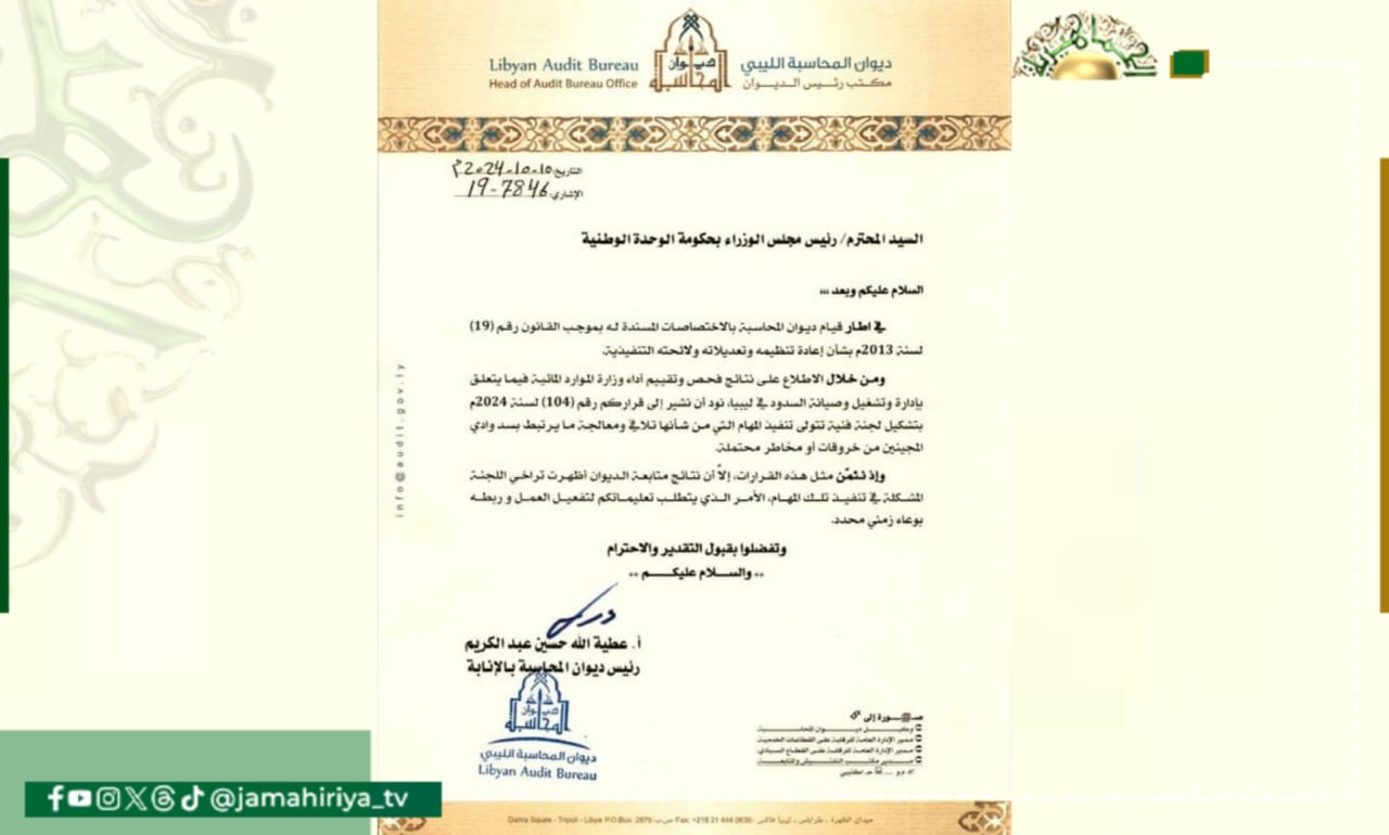 خاطب رئيس ديوان المحاسبة بالإنابة، عطية الله حسين عبد الكريم يخاطب رئيس حكومة التطبيع عبد الحميد الدبيبة تفعيل عمل اللجنة الفنية المشكلة في تنفيذ مهام معالجة سد وادي المجينين وتلافي الخروقات أو المخاطر المحتملة.