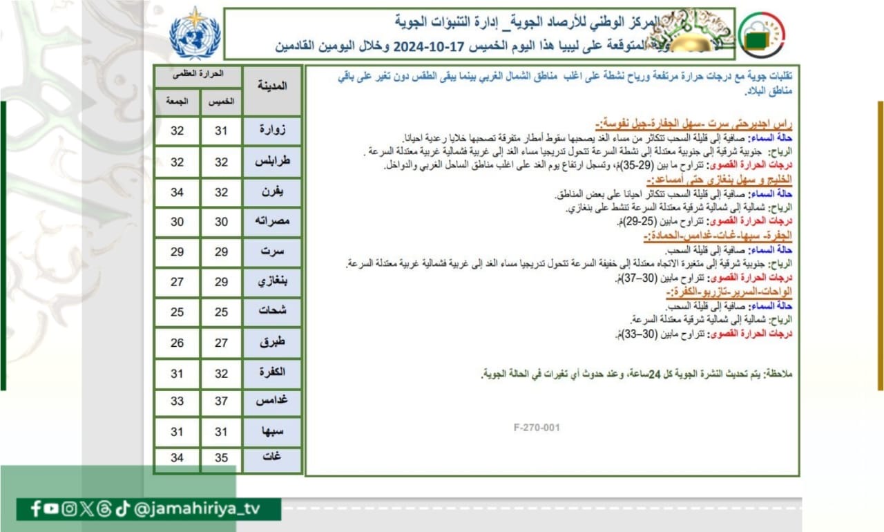 السماء صافية إلى قليلة السحب تتكاثر أحيانا على بعض المناطق والرياح شمالية إلى شمالية شرقية معتدلة السرعة تنشط على بنغازي ودرجات الحرارة القصوى تتراوح بين 25 و29 درجة مئوية.