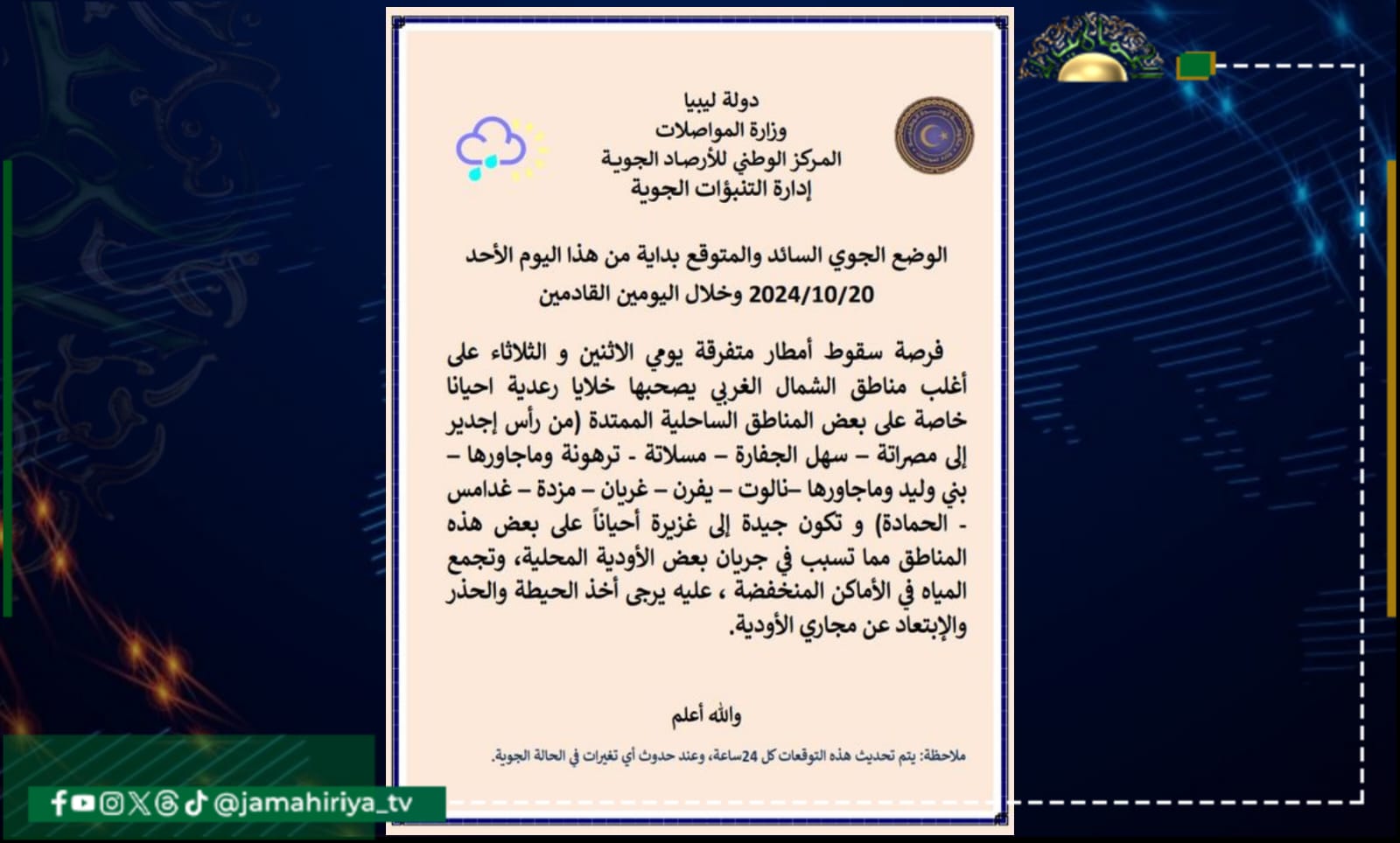 وجاء بيان الأحوال الجوية المتوقعة على ليبيا اليوم كالتالي:-