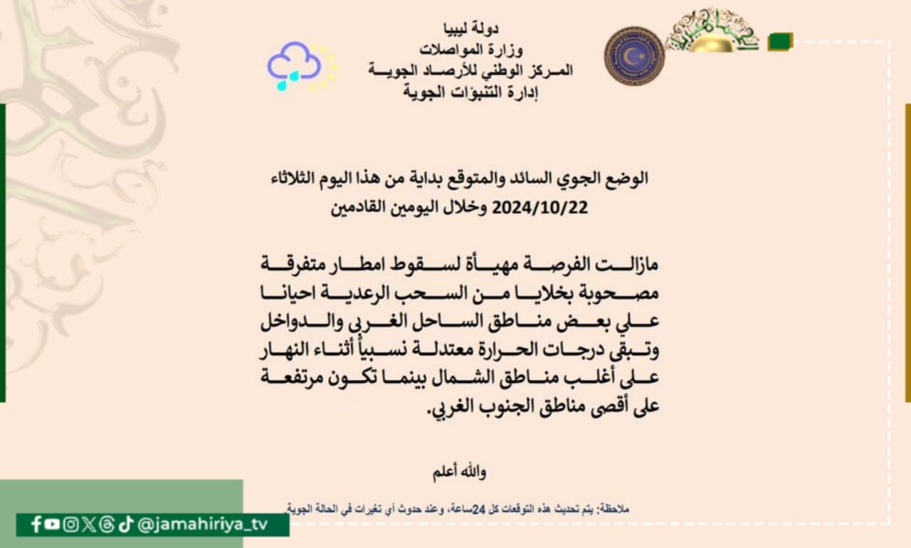 قال مركز الأرصاد الجوية، إنه مازالت الفرصة مهيأة لسقوط أمطار متفرقة يتخللها خلايا من السحب الرعدية احيانا على بعض مناطق الساحل الغربي والدواخل.