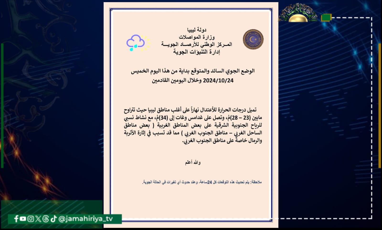 توقع مركز الأرصاد الجوية أن تميل درجات الحرارة للاعتدال نهاراً على أغلب مناطق ليبيا حيث تتراوح مابين (23 – 28)مْ، وتصل على غدامس وغات إلى (34)مْ، مع نشاط نسبي للرياح الجنوبية الشرقية على بعض المناطق الغربية ( بعض مناطق الساحل الغربي – مناطق الجنوب الغربي ) مما قد تسبب في إثارة الأتربة والرمال خاصةً على مناطق الجنوب الغربي.