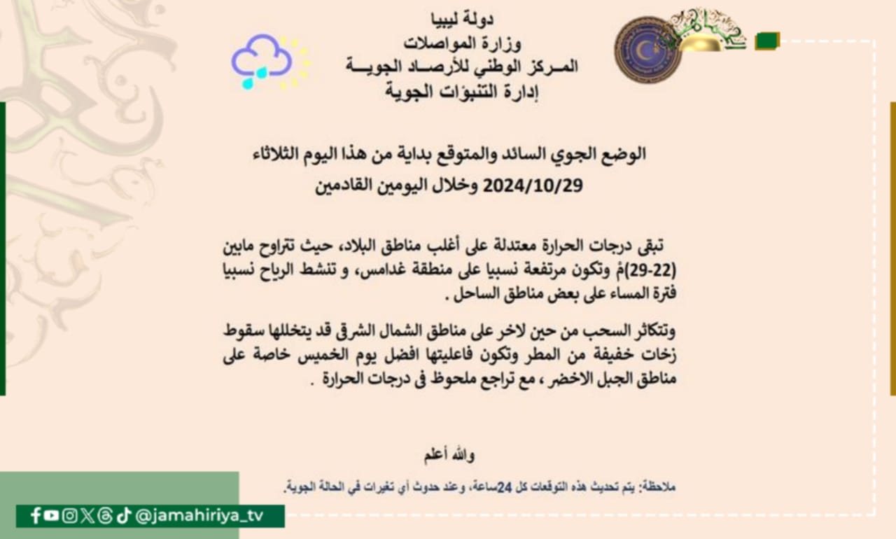وجاء بيان الأحوال الجوية كالتالي