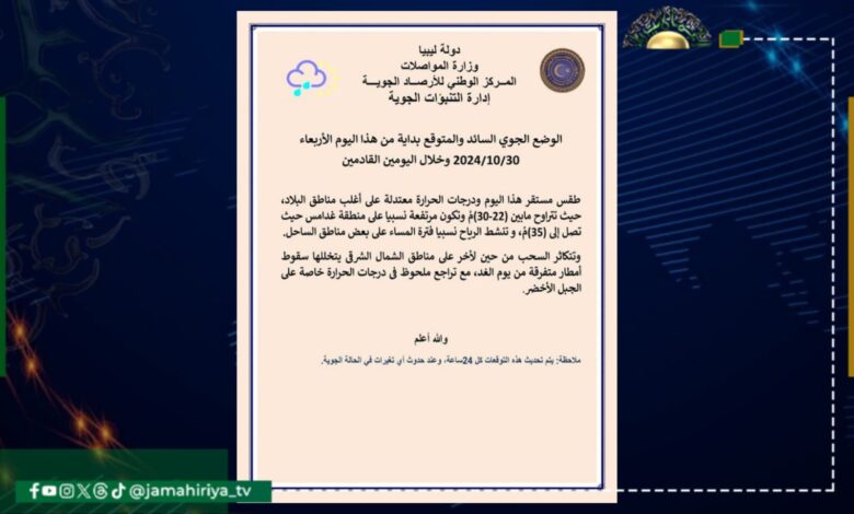 وجاء بيان الأحوال الجوية المتوقعة على ليبيا اليوم كالتالي: