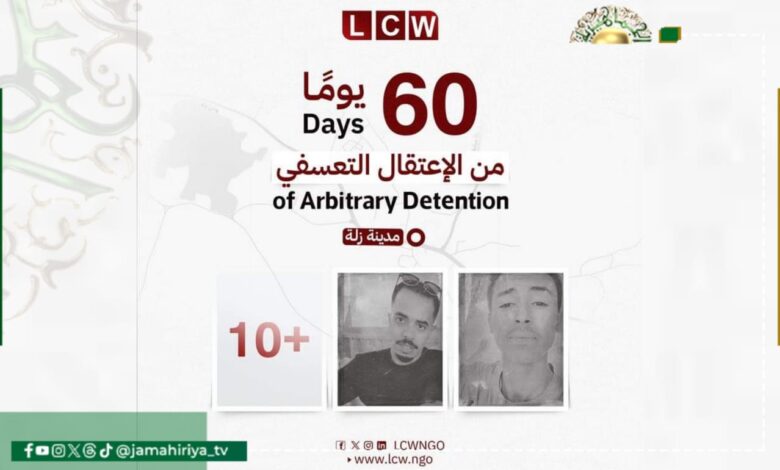 وثقت منظمة رصد الجرائم في ليبيا اعتقال عناصر جهاز الأمن الداخلي هون لـ12 مدنيًا بينهم قاصران لليوم الـ60 منذ أول سبتمبر الماضي بعد مشاركتهم في مسيرة مؤيدة للنظام الجماهيري في مدينة زلة.