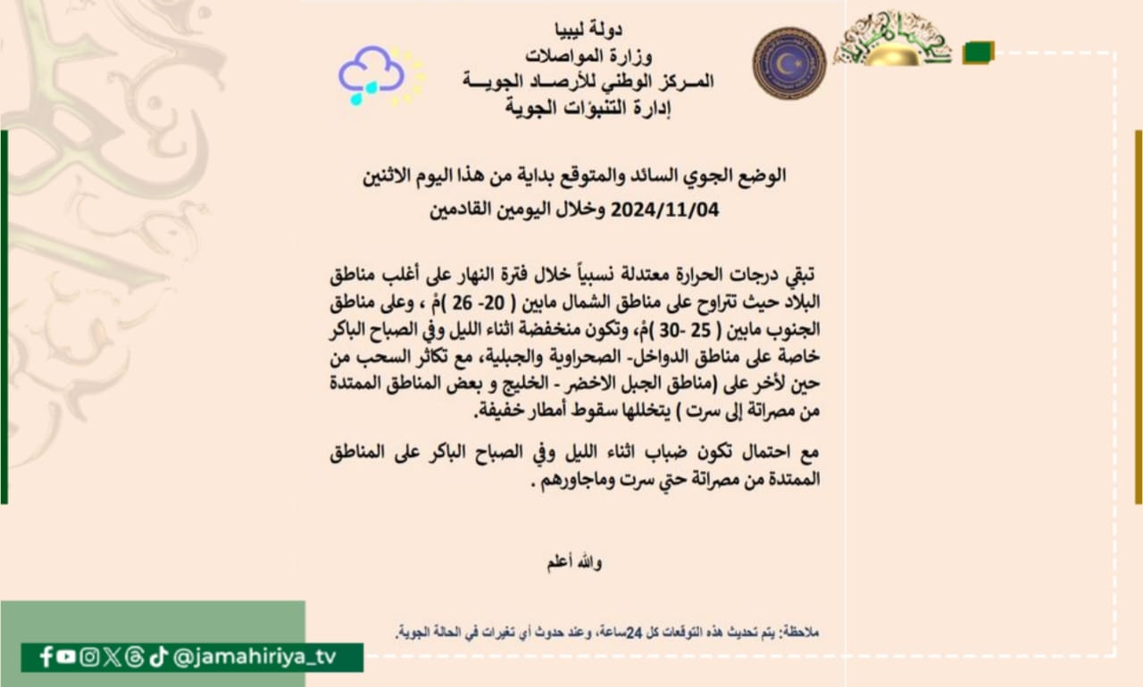 وجاء بيان الأحوال الجوية المتوقعة على ليبيا اليوم كالتالي:-