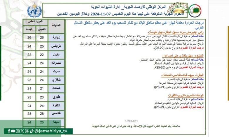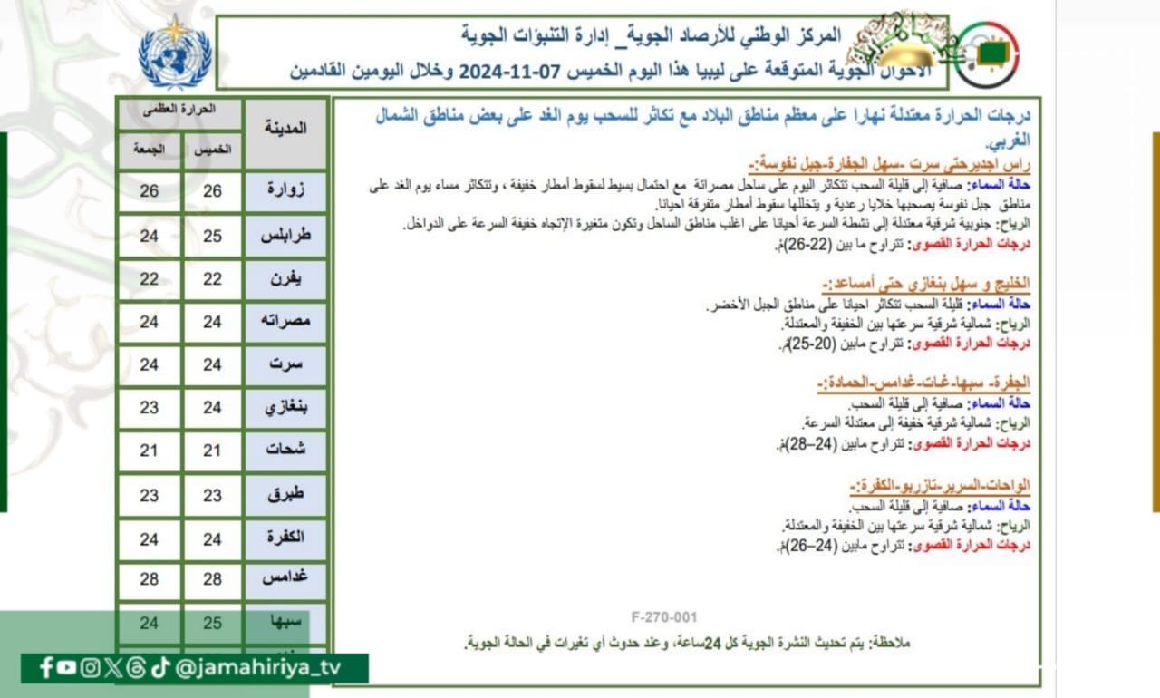 وتتكاثر اليوم السحب على ساحل مصراتة مع احتمال بسيط لسقوط أمطار خفيفة ، وتتكاثر مساء يوم الغد على مناطق جبل نفوسة يصحبها خلايا رعدية و يتخللها سقوط أمطار متفرقة احيانا.