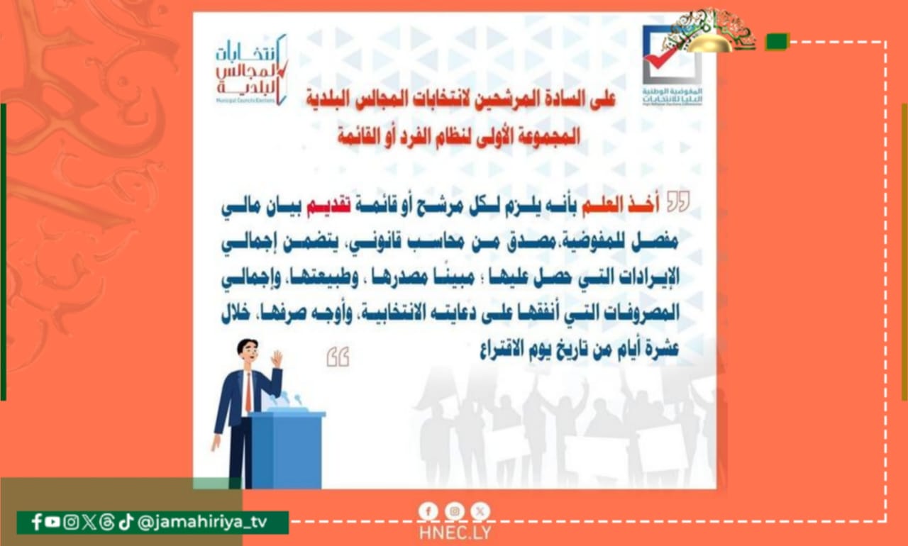 وأوضحت المفوضية، في بيان طالعته”الجماهيرية”، يلزم لكل مرشح أو قائمة تقديم بيان مالي مفصل للمفوضية، مصدق من محاسب قانوني، يتضمن إجمالي الإيرادات التي حصل عليها ؛ مبينًا مصدرها، وطبيعتها، وإجمالي المصروفات التي أنفقها على دعايته الانتخابية، وأوجه صرفها، خلال عشرة أيام من تاريخ يوم الاقتراع، وذلك للمرشحين لانتخابات المجالس البلدية المجموعة الأولى لنظام الفرد أو القائمة.