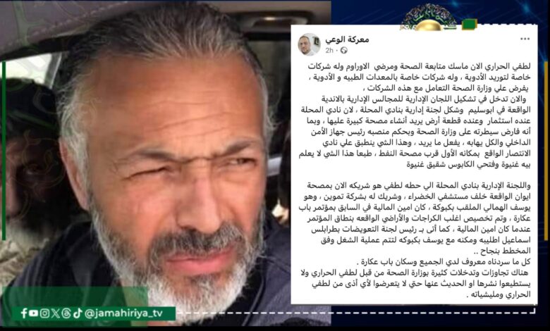 وقال عمار في منشور عبر “فيس بوك” إن الحراري تدخل في تشكيل اللجان الإدارية لمجالس الأندية الواقعة في أبوسليم وشكل لجنة إدارية بنادي المحلة، مشيرا إلى أن نادي المحلة لديه استثمار وقطعة أرض يريد إنشاء مصحة كبيرة عليها.