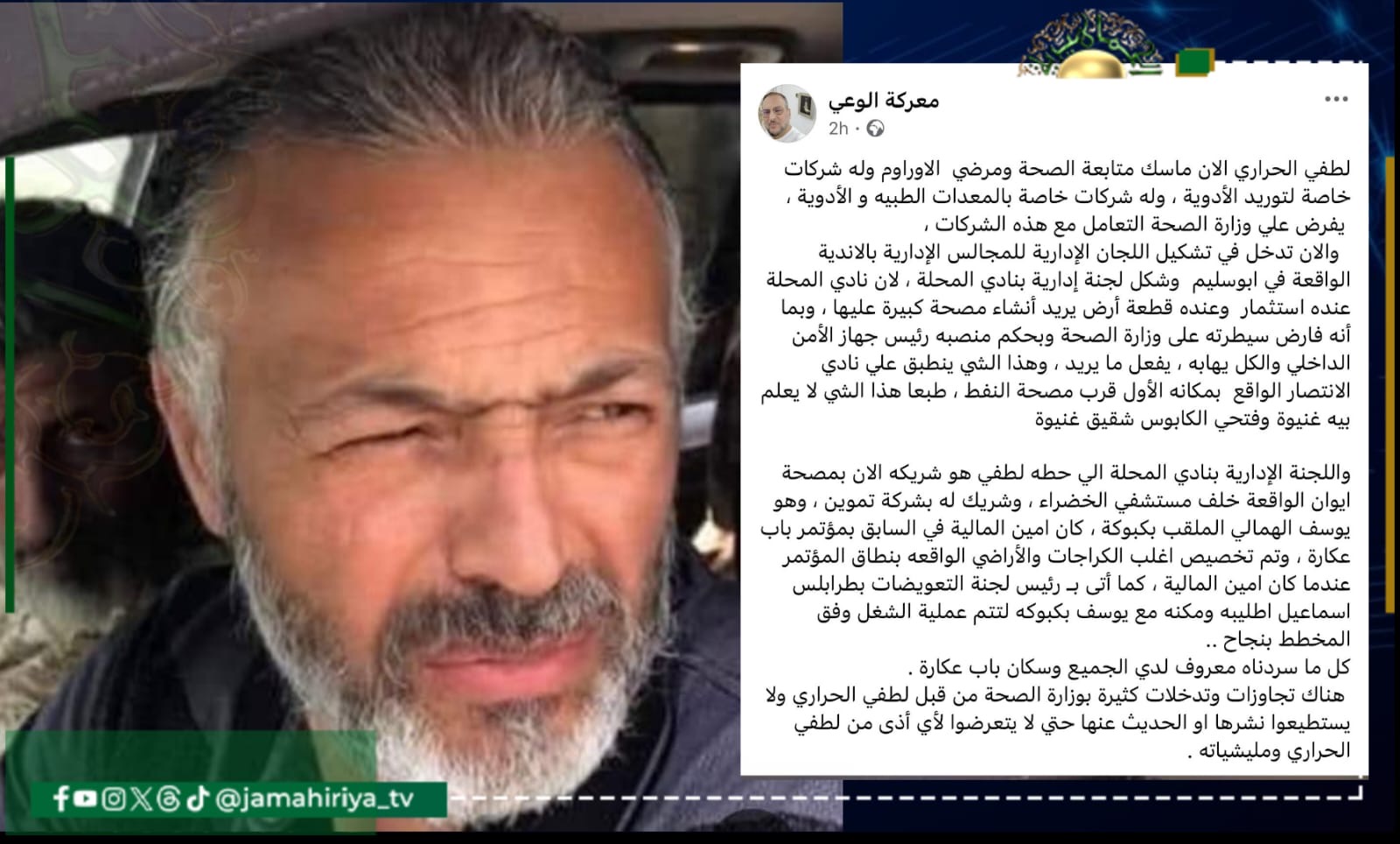 وأشار عمار، إلى أن الحراري يفرض سيطرته على وزارة الصحة بحكم منصبه رئيس جهاز الأمن الداخلي والكل يهابه، يفعل ما يريد، وهذا الشي ينطبق علي نادي الانتصار الواقع بمكانه الأول قرب مصحة النفط، متابعا ” طبعا هذا الشي لا يعلم بيه غنيوة وفتحي الكابوس شقيق غنيوة”.