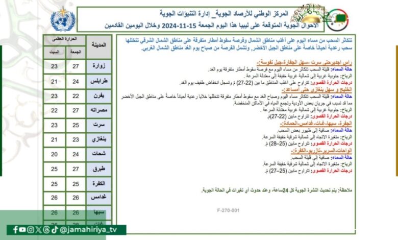 توقع المركز الوطني للأرصاد الجوية اليوم الجمعة طقس معتدل نهاراً على أغلب مناطق البلاد ، حيث تتراوح درجات الحرارة مابين (22-27)مْ ،وتسجل تراجع طفيف من مساء اليوم على أغلب مناطق الشمال خاصة مناطق الجبل الاخضر.