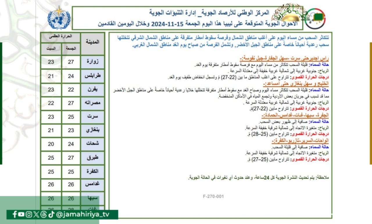 وبحسب المركز الوطني للأرصاد الجوية، تكاثر السحب من مساء اليوم وصباح الغد على أغلب مناطق الشمال مع فرصة سقوط أمطار متفرقة على مناطق الشمال الشرقي تتخللها سحب رعدية أحياناً خاصة على مناطق الجبل الأخضر مما قد تسبب في جريان بعض الأودية وتجمع المياه في الأماكن المنخفضة.