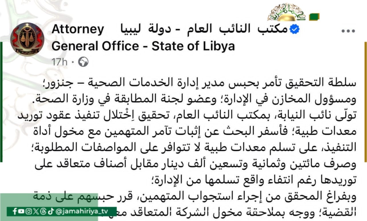 أمر مكتب النائب العام بحبس مدير إدارة الخدمات الصحية جنزور، ومسؤول المخازن في الإدارة، وعضو لجنة المطابقة في وزارة الصحة.
