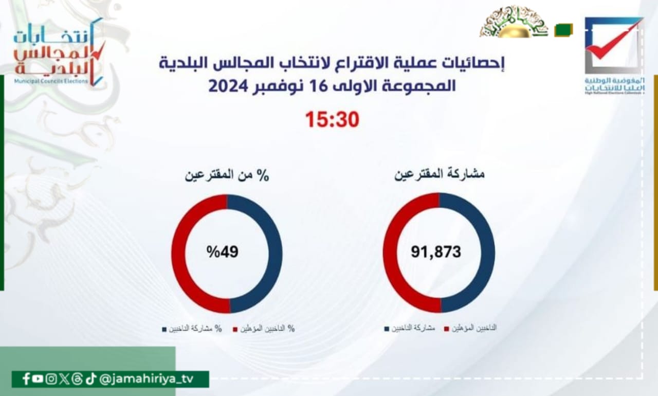 عاجل// مفوضية الانتخابات: بلوغ عدد المشاركين في انتخابات المجالس البلدية حتى الآن 91.8 ألف مشارك بنسبة بلغت 49%.