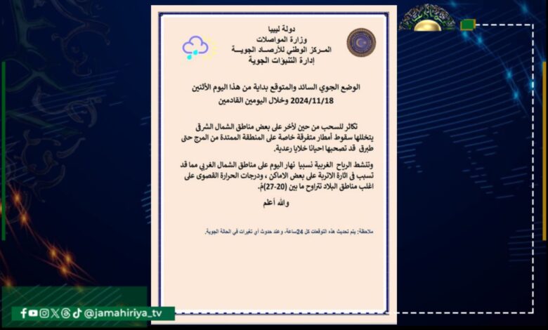 تكاثر للسحب من حين لأخر على بعض مناطق الشمال الشرقي يتخللها سقوط أمطار متفرقة خاصة على المنطقة الممتدة من المرج حتى طبرق قد تصحبها أحيانا خلايا رعدية.