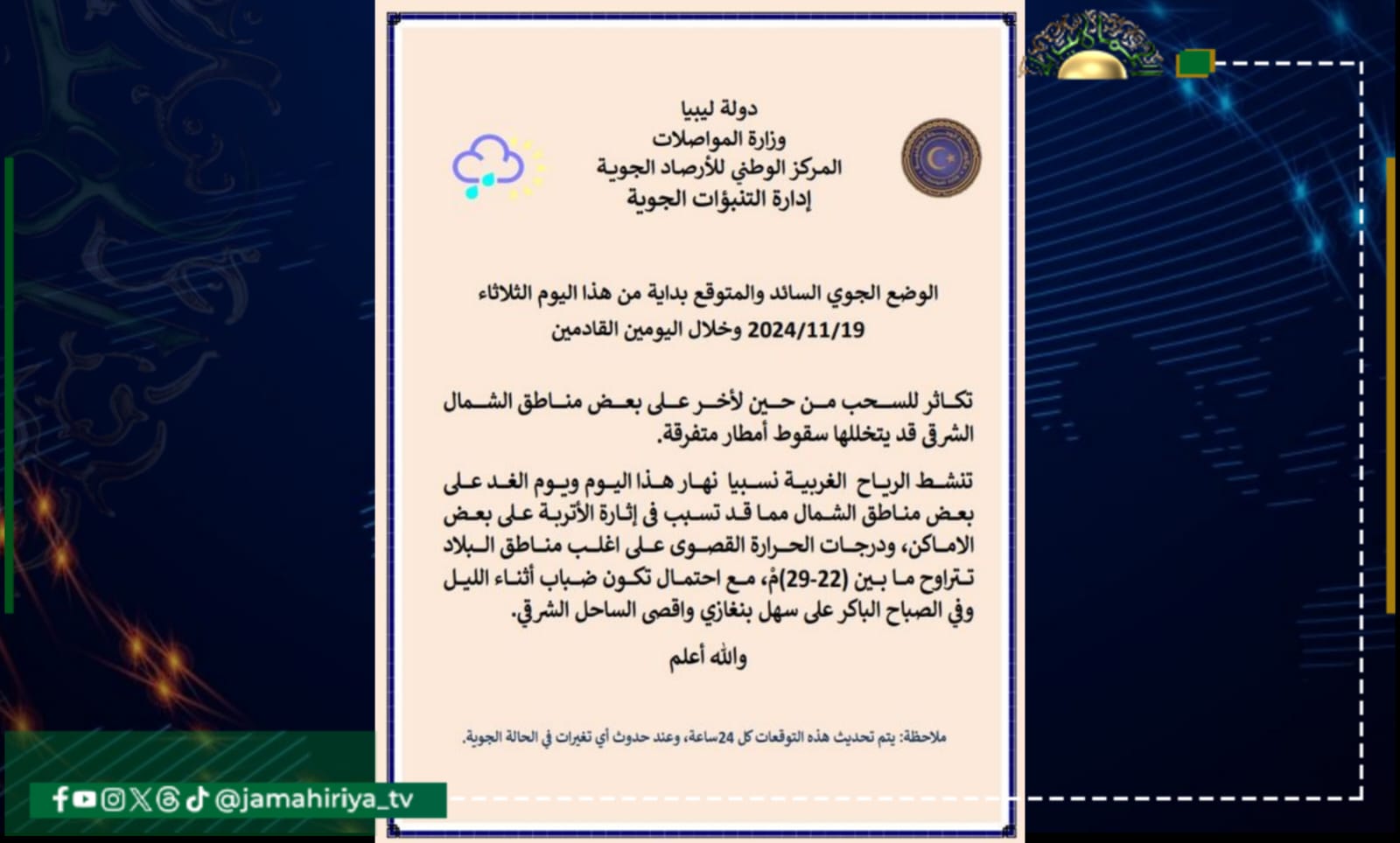 وجاء بيان الأحوال الجوية المتوقعة على ليبيا اليوم كالتالي:-