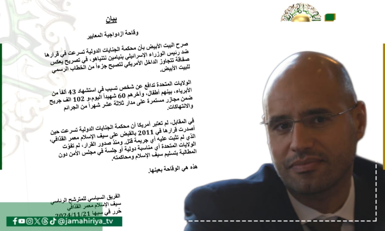 أصدر الفريق السياسي للدكتور سيف الإسلام القذافي بيانا بشأن تعليق البيت الأبيض على قرار الجنائية الدولية حول نتنياهو ووزير دفاعه