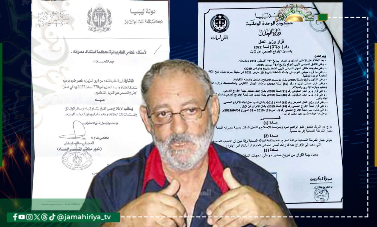 اصدرت وزيرة العدل بحكومة التطبيع قرارا بالإفراج الصحي عن منصور ضو إبراهيم المسجون في مدينة مصراتة.