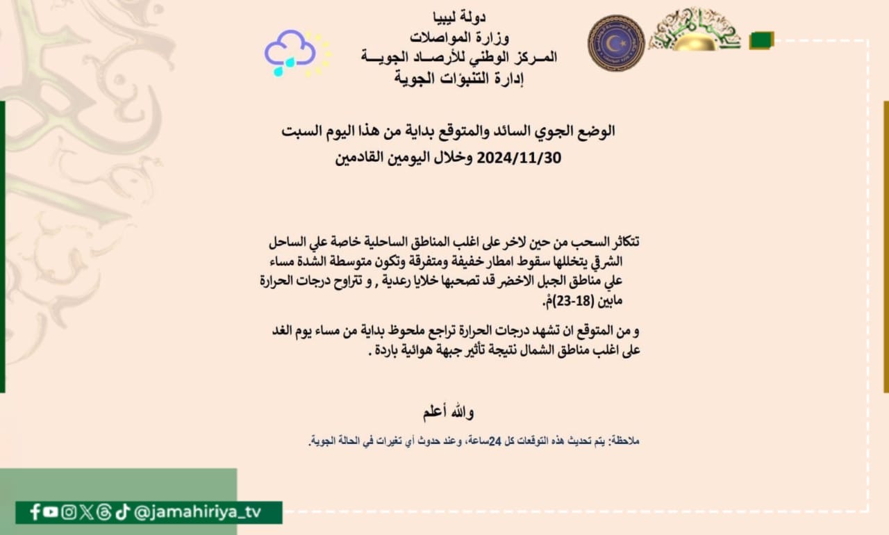 توقع المركز الوطني للأرصاد الجوية، تكاثر السحب من حين لاخر على أغلب المناطق الساحلية خاصة علي الساحل الشرقي يتخللها سقوط امطار خفيفة ومتفرقة وتكون متوسطة الشدة مساء على مناطق الجبل الاخضر قد تصحبها خلايا رعدية , و تتراوح درجات الحرارة مابين (18-23)مْ.