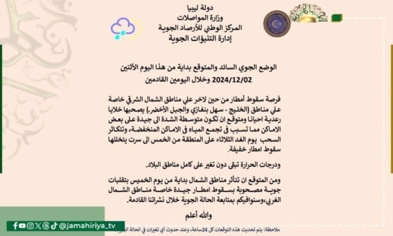 توقع المركز الوطني للأرصاد، أن هناك فرصة لسقوط أمطار من حين لاخر على مناطق الشمال الشرقي خاصة علي مناطق (الخليج – سهل بنغازي والجبل الأخضر) يصحبها خلايا رعدية احيانا ومتوقع ان تكون متوسطة الشدة الى جيدة على بعض الأماكن مما تسبب فى تجمع المياه فى الأماكن المنخفضة، وتتكاثر السحب يوم الغد الثلاثاء على المنطقة من الخمس الى سرت يتخللها سقوط امطار خفيفة.