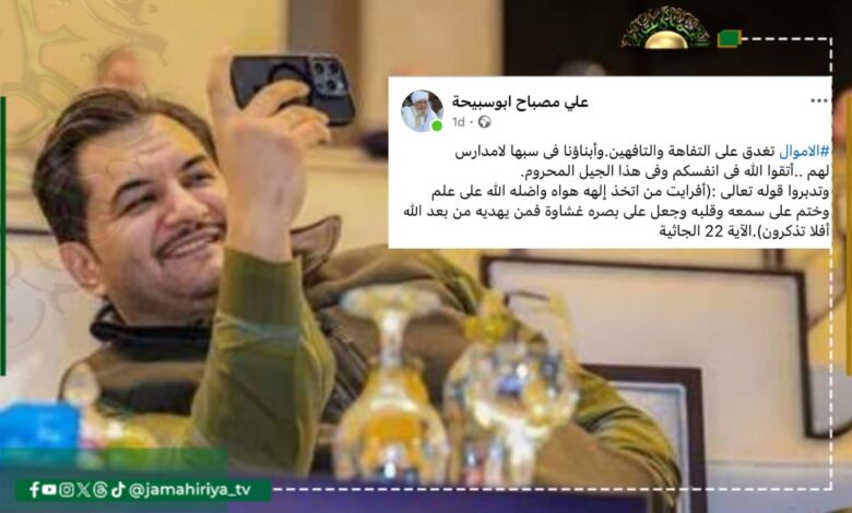 وتعليقا على ذلك، كتب علي أبو سبيحة رئيس فريق المصالحة التابع للدكتور سيف الإسلام القذافي، في تدوينة على صفحته بموقع فيسبوك “الأموال تغدق على التفاهة والتافهين، وأبناؤنا في سبها لا مدارس لهم، اتقوا الله في هذا الجيل المحروم”.