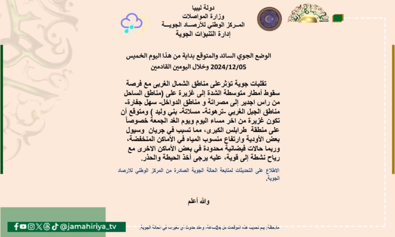 ورجح المركز، في نشرته اليومية، سقوط أمطار متوسطة الشدة إلى غزيرة من ظهر اليوم ويوم الغد الجمعة على (مناطق الساحل من راس اجدير إلى مصراتة ومناطق الدواخل- سهل جفارة- مناطق الجبل الغربي -ترهونة- مسلاته-بني وليد ) ومتوقع ان تكون غزيرة خصوصاً على منطقة طرابلس الكبرى مصحوبة بخلايا رعدية احيانا، مما تسبب في جريان بعض الأودية والسيول وارتفاع منسوب المياه في الأماكن المنخفضة، وربما حالات فيضانيه محدودة في بعض الأماكن الأخرى عليه اخذ الحيطة والحذر.