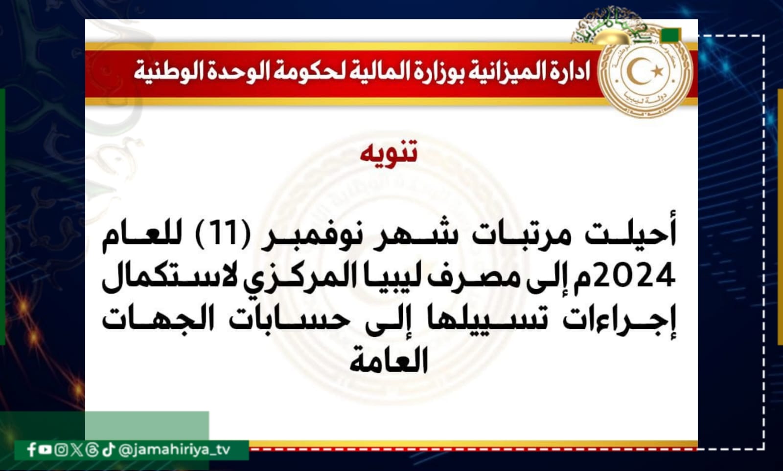 عاجل// مالية الدبيبة تعلن إحالة مرتبات شهر نوفمبر إلى مصرف ليبيا المركزي لاستكمال إجراءات تسييلها إلى حسابات الجهات العامة.