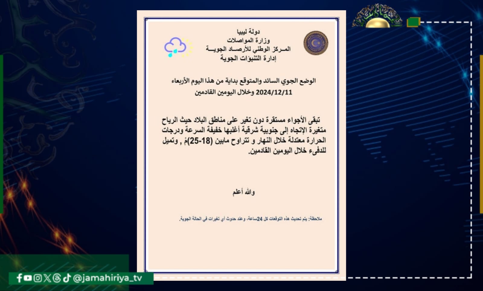 وجاء بيان الأحوال الجوية المتوقعة على ليبيا اليوم:-