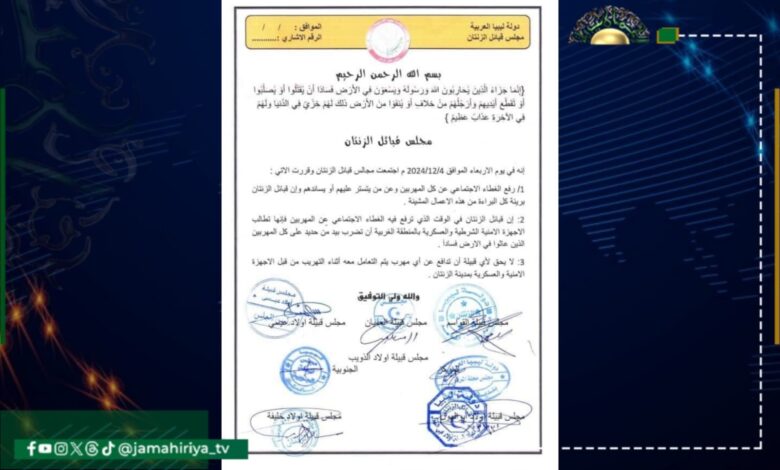أعلن مجلس قبائل الزنتان، في بيان له، رفع الغطاء الاجتماعي عن كل المهربين، وعن من يتستر عليهم أو يساندهم، ويُبرّيء القبائل من هذه الأفعال المشينة.