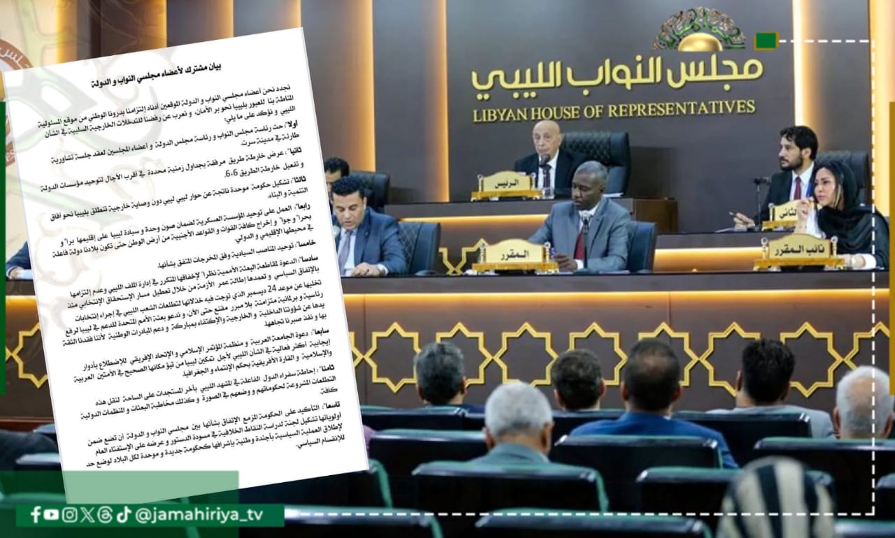 ودعا البيان، المجلسين للعمل على توحيد المؤسسة العسكرية لضمان صون وحدة وسيادة ليبيا، وإخراج كافة القوات والقواعد الأجنبية، ومقاطعة البعثة الأممية لإخفاقها المتكرر في إدارة الملف الليبي وعدم التزامها بالاتفاق السياسي.
