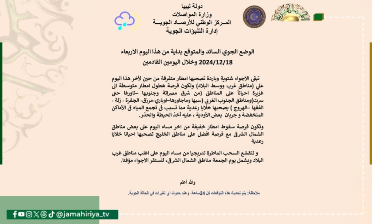 وجاء بيان الأحوال الجوية المتوقعة على ليبيا اليوم كالتالي:-