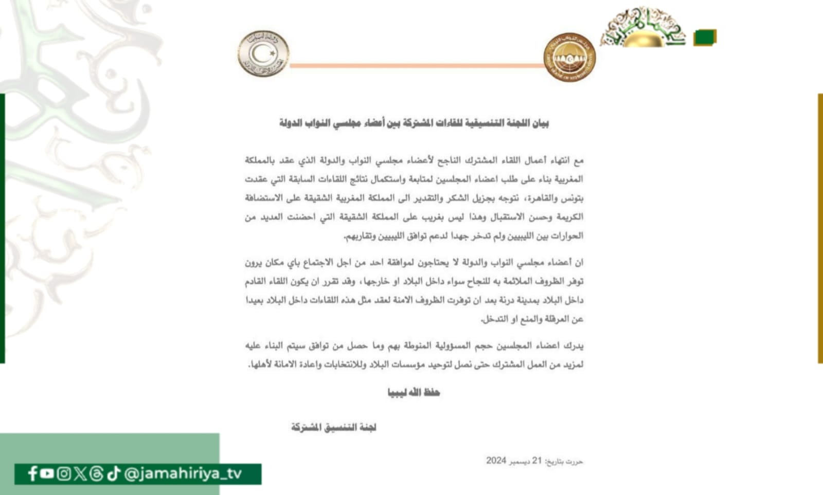 وجاء ذلك، في بيان لها مع انتهاء أعمال اللقاء المشترك الذي عقد بالمملكة المغربية بناء على طلب اعضاء المجلسين لمتابعة واستكمال نتائج اللقاءات السابقة التي عقدت بتونس والقاهرة.