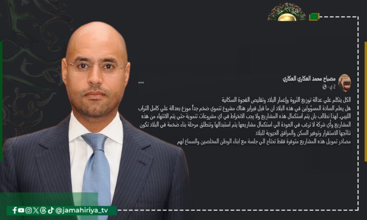 وطالب العكاري، باستكمال المشروع وعدم خوض رئيس حكومة التطبيع عبد الحميد الدبيبة، والمواطن الأمريكي خليفة حفتر في مشاريع أخرى.